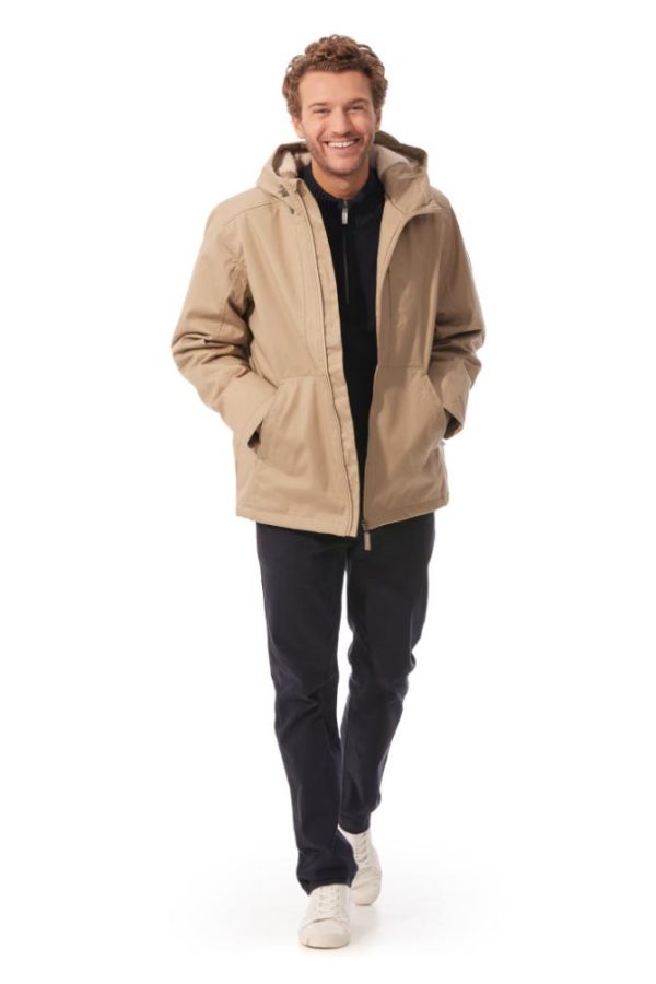 Capuche doublée moutonnée écru Doublure intérieure imprimée Coutures étanches Ouverture zippée Réglage par cordon élastiqué et stoppeurs à la capuche et en bas. Poche poitrine verticale
