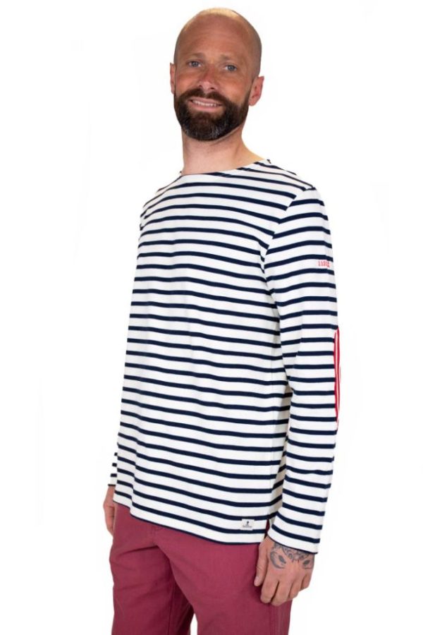 Cette marinière est inspirée de la navigation en mer d’où ces inscriptions bâbord-tribord et ces couleurs rouges et vertes sur les manches.