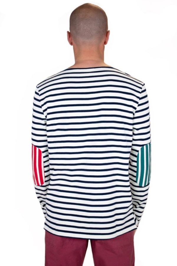Craquez pour Mario batri, la petite dernière du vestiaire rayé Mousqueton ! Tricoté dans un jersey de coton, Mario batri se distingue par ses jolies broderies bâbord-tribord et ses coudières de couleurs contrastées. Vous allez adorer arborer cette marinière avec votre vareuse préférée.