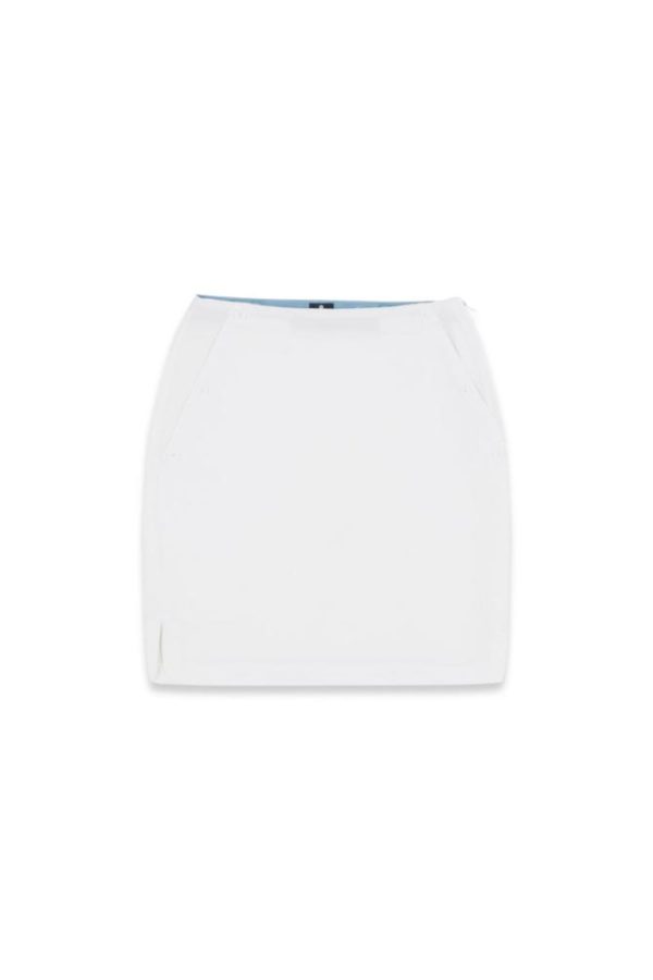 Coupe droite avec bas légèrement arrondis, taille haute appuyée et longueur au-dessus du genou.