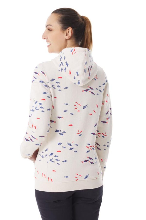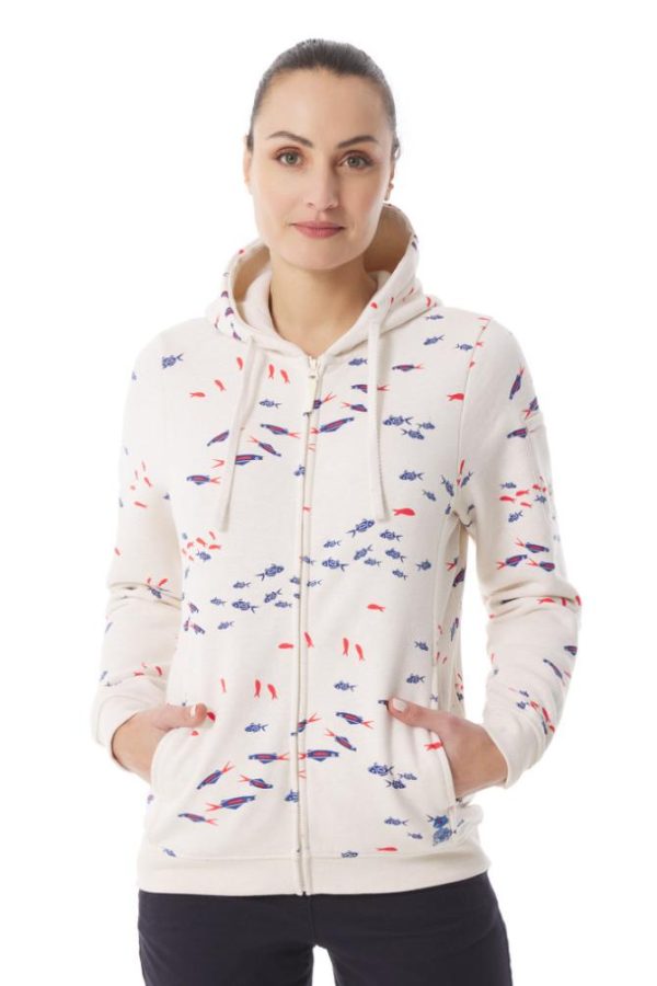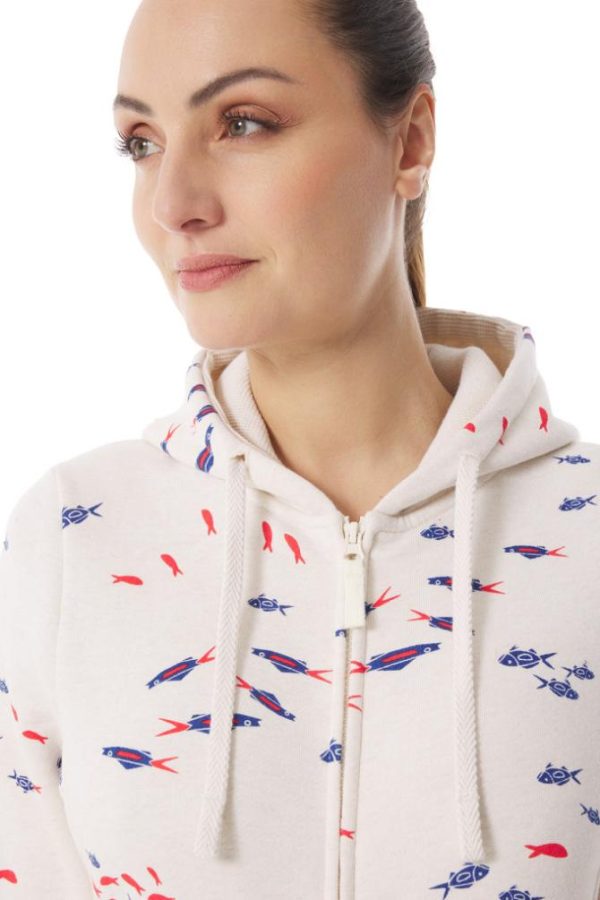 Ajoutez une touche de fantaisie à vos tenues sportswear grâce à ce sweat à capuche ! Les motifs de poissons, créés avec la technique de linogravure par l’artiste bretonne Morgane Chouin, décorent joliment ce sweat zippé femme. Il vous enveloppe de douceur grâce à sa matière en coton molletonné. Laissez-vous séduire par le look tendance et décontracté de ce sweat à capuche à motifs.